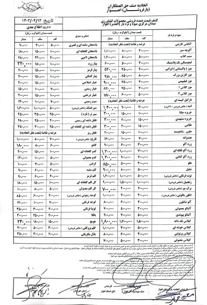 نرخنامه ۱۳ تیرماه ۱۴۰۳ میدان مرکزی الغدیر اهواز