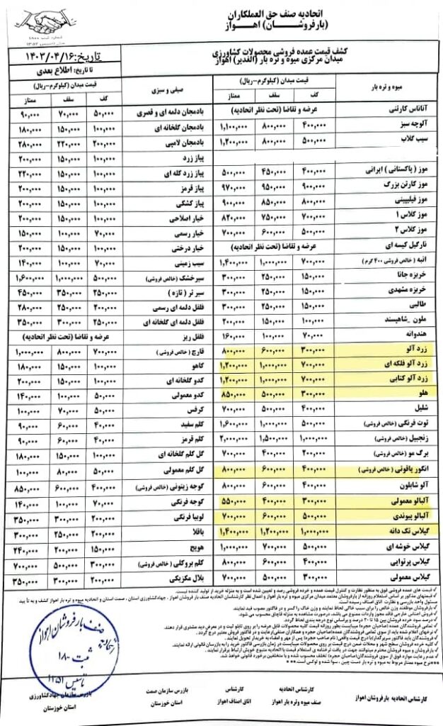 نرخنامه ۱۶ تیرماه ۱۴۰۳ میدان مرکزی الغدیر اهواز