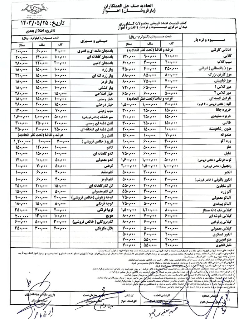 نرخنامه ۲۵ مرداد ماه ۱۴۰۳ میدان مرکزی الغدیر اهواز