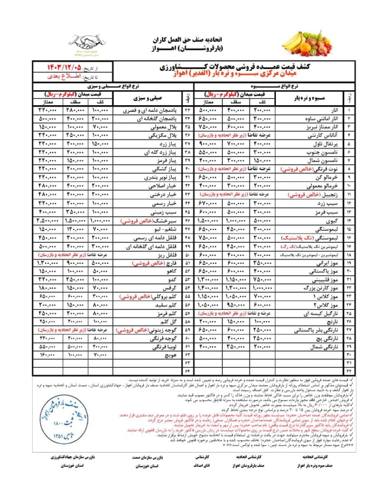 به گزارش روابط عمومی اتحادیه صنف بارفروشان اهواز: این اتحادیه در راستای شفاف سازی و نظارت عمومی برقیمت ها اقدام به انتشار نرخنامه مصوب می نماید.
