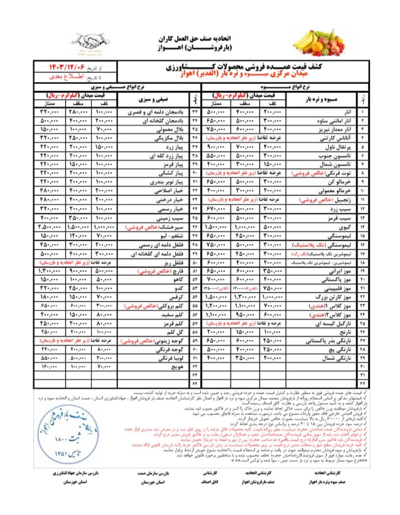 به گزارش روابط عمومی اتحادیه صنف بارفروشان اهواز: این اتحادیه در راستای شفاف سازی و نظارت عمومی برقیمت ها اقدام به انتشار نرخنامه مصوب می نماید.